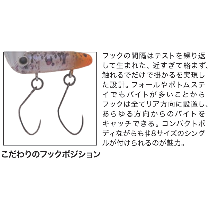フックの位置とサイズにもこだわり、スイム姿勢に合わせたフッキングとトラブルレスを両立させるボディに対して大きめのフックを装着。