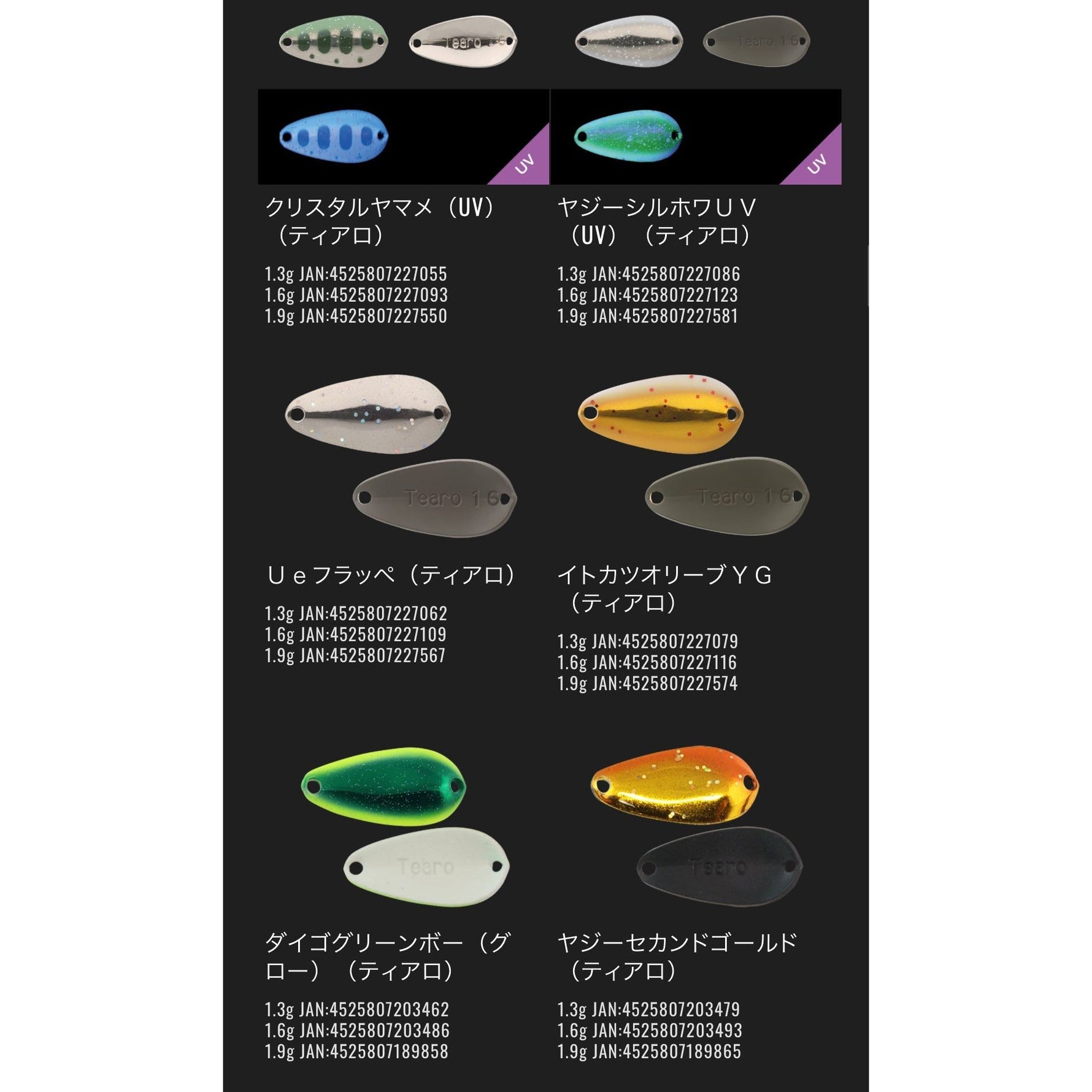 イズラインナップ釣り場に着いて、まず状況を探りたい時、活性の高い時はノーマルティアロ。トラウトのサイズが小さい時やシルエットを落としたい時はちびティアロをお使いください。
