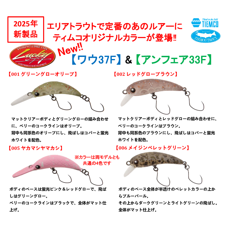 エリアシーンにて活躍中の、ラッキークラフトの【ワウ37F】&【アンフェア33F】に、ティムコオリジナルカラーの4色が登場!