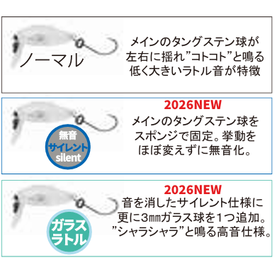 シケイダーと比べるとかなり小ぶりですが、アピールは強いです。また特筆すべきは「音」です。内蔵されたラトルがジャラジャラと大きな音を出して魚を寄せます。